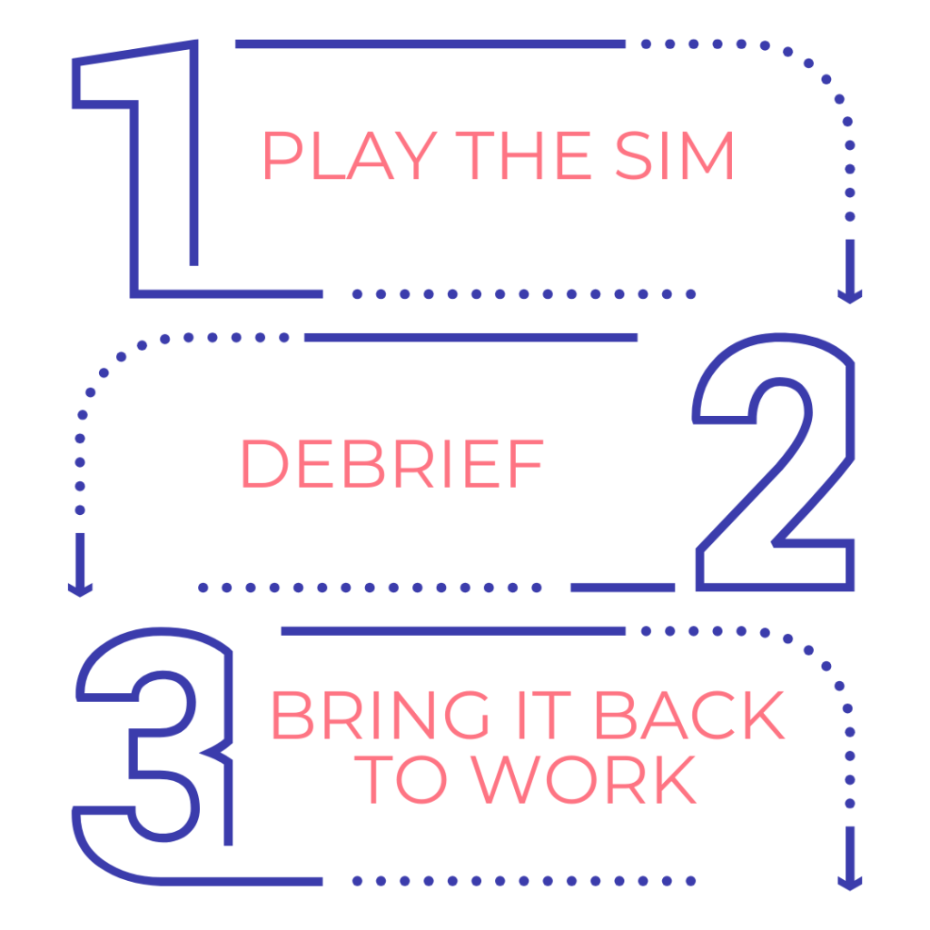 2. Learn in Debrief: After the simulation, participate in a comprehensive debriefing session. Here, you’ll reflect on your experiences, deepen your understanding of key concepts, and discuss insights gained during the game.